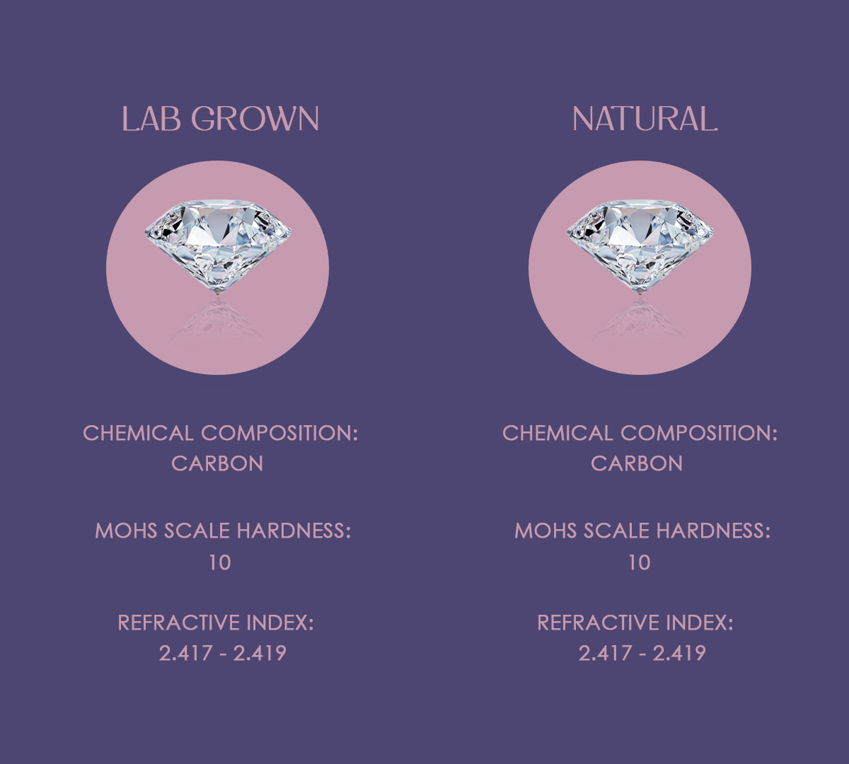 Lab grown diamonds have the same physical and chemical properties as mined diamonds, which means they are just as hard and just as durable. The only difference appears in the trace elements found within the diamond. It takes specialized equipment to identify a lab grown diamond vs natural grown diamonds.